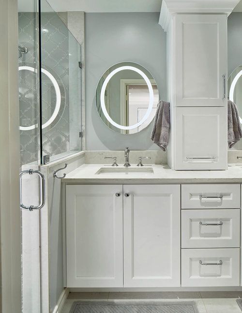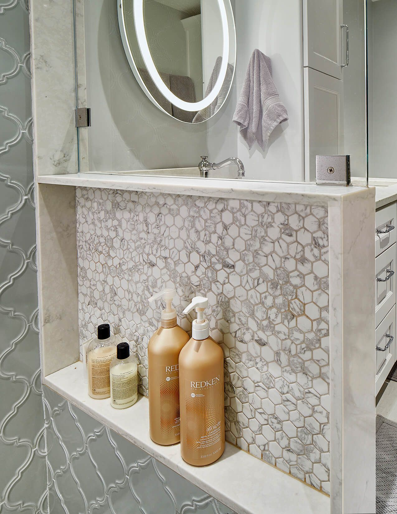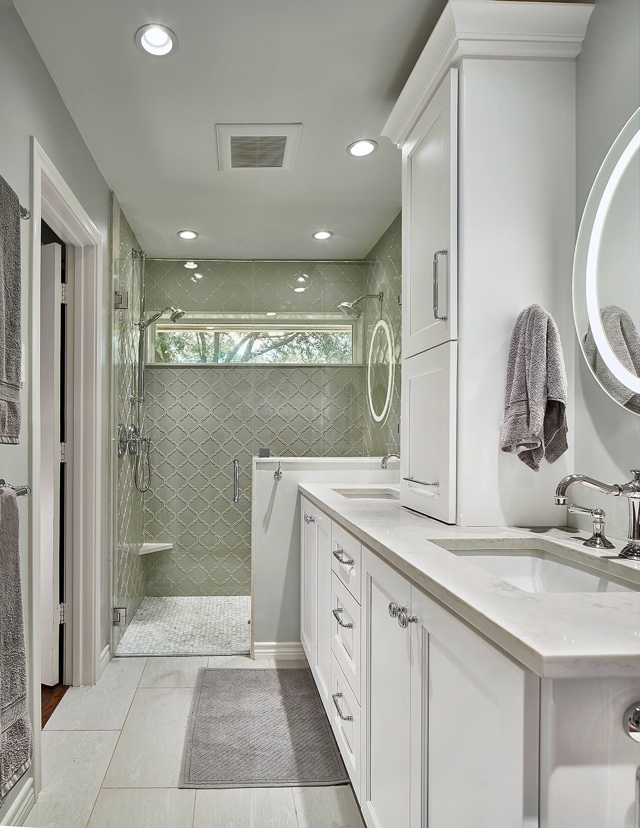 Our customers were looking to make their small, dated master bathroom more functional and beautiful. The previous layout wasted counter and cabinet space, while the tub, toilet, and linen closet were cramped. We rearranged the layout and plumbing to maximize storage and reconfigured the window to allow for more natural light. Custom features, such as the frameless, curbless shower with hidden shower niche, lighted mirrors, and custom cabinetry created an efficient but tranquil master bath.