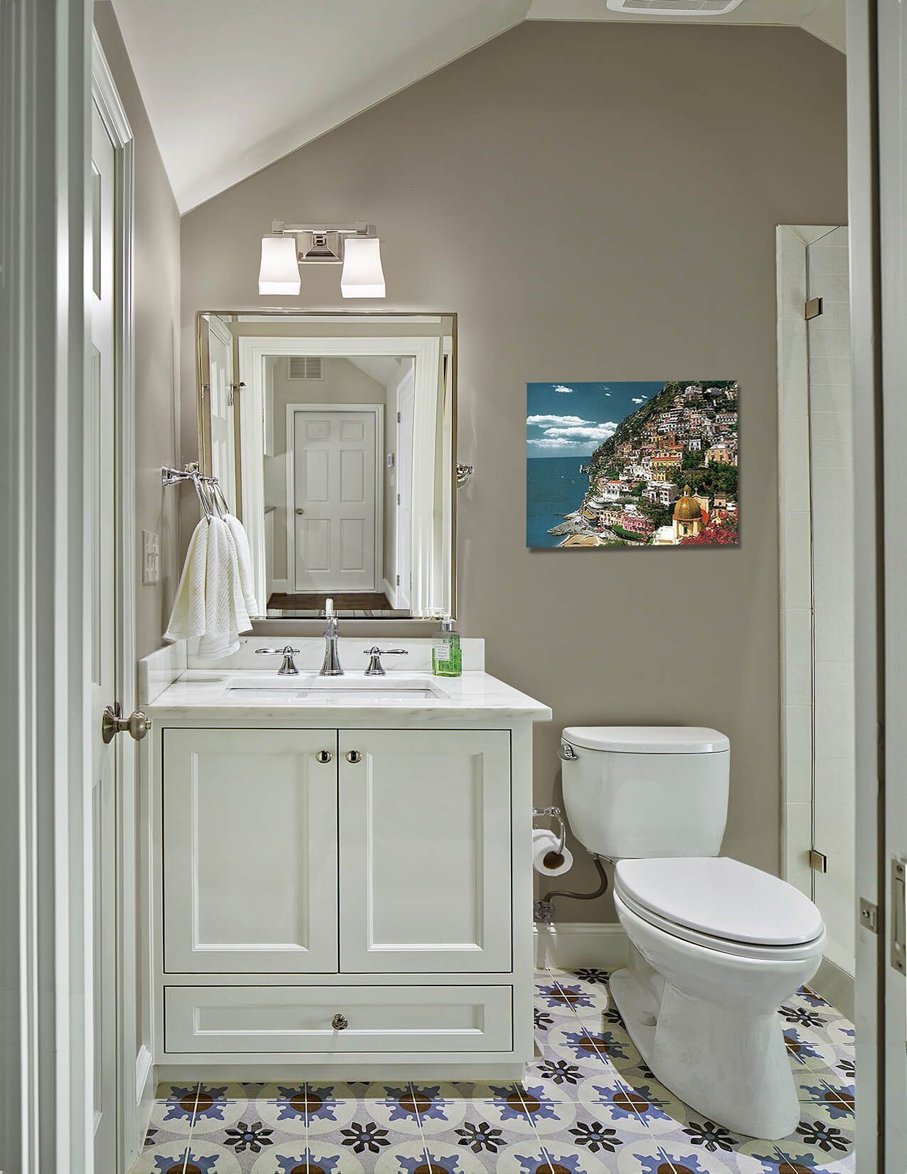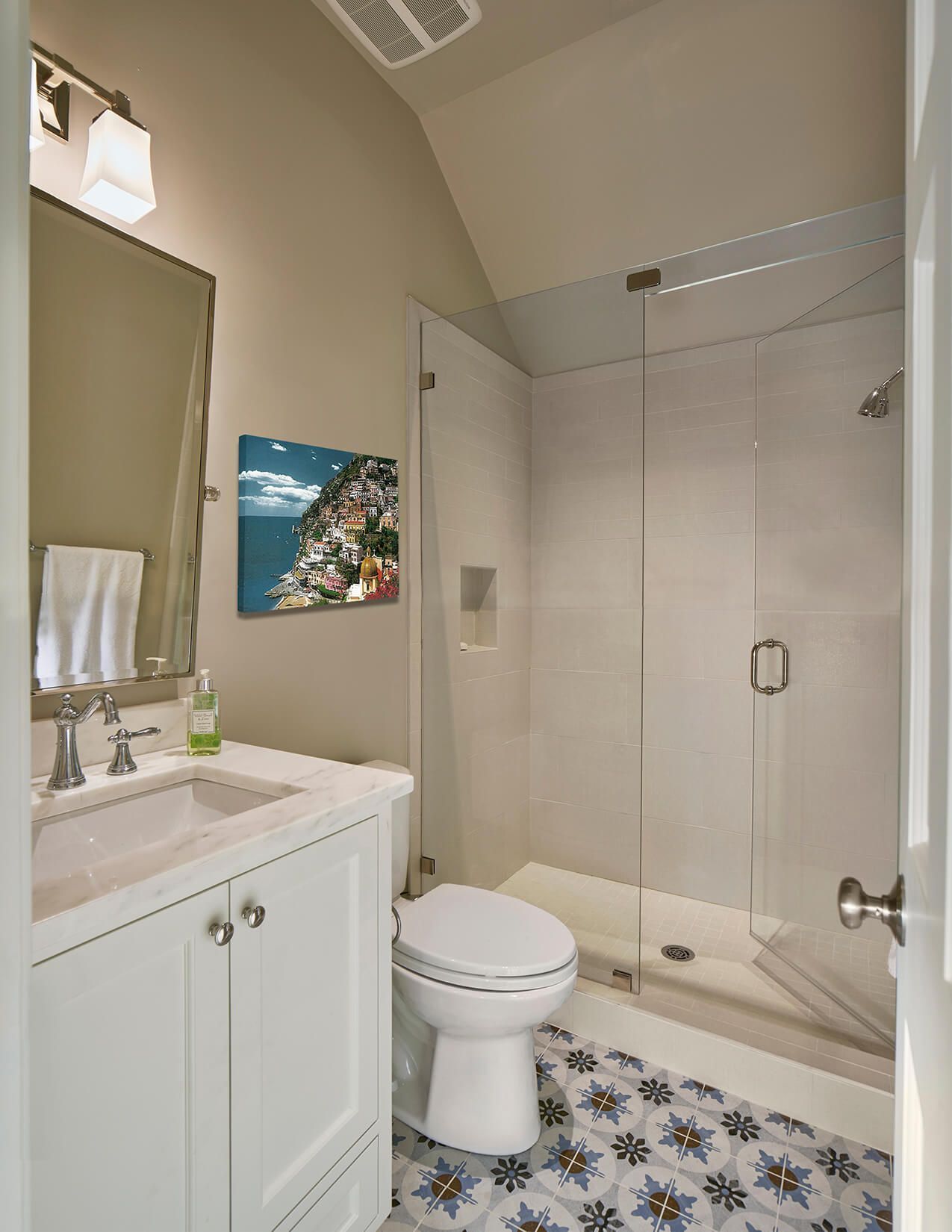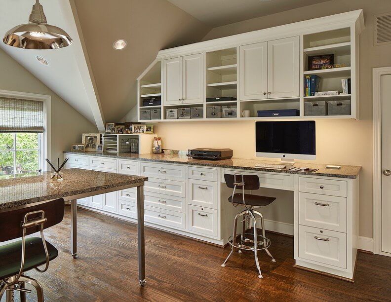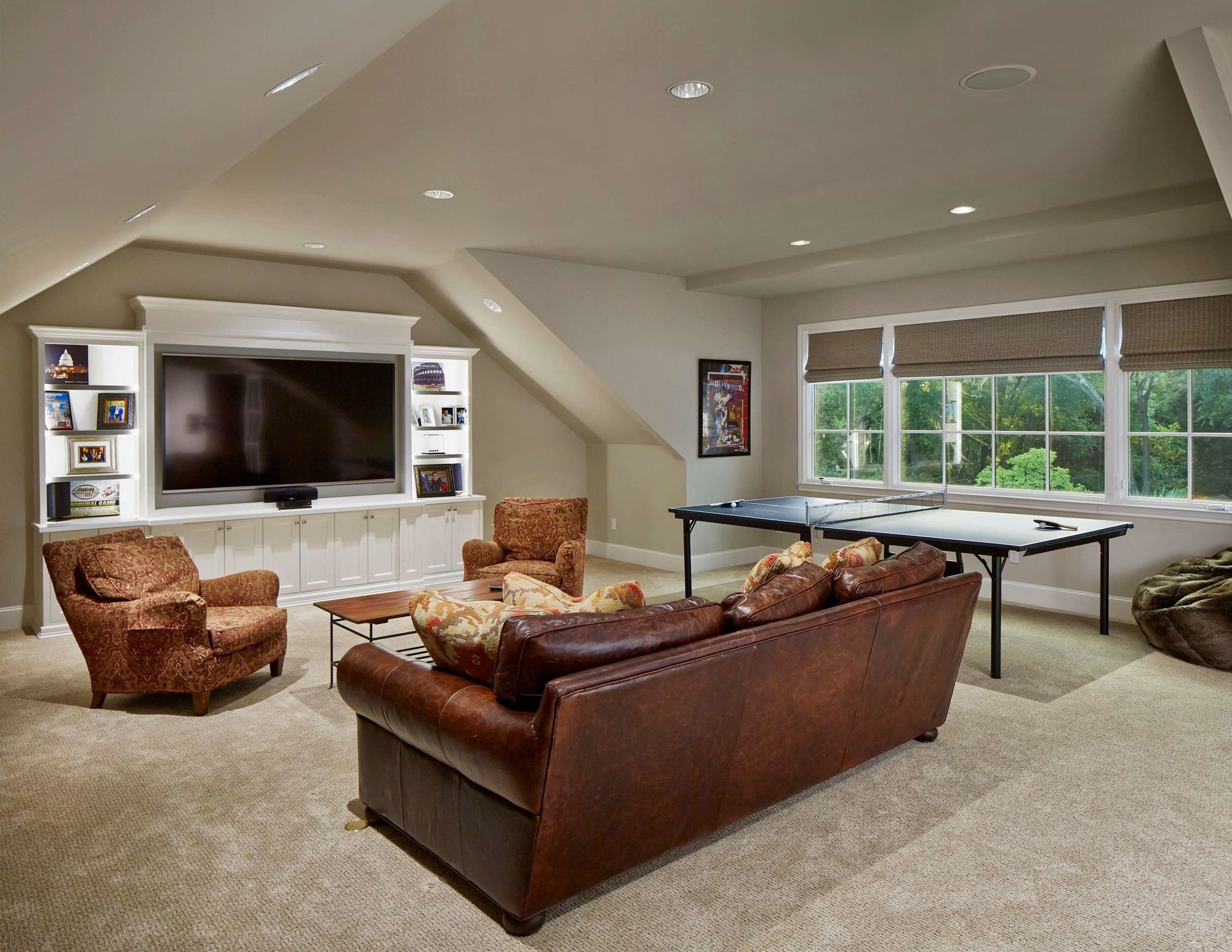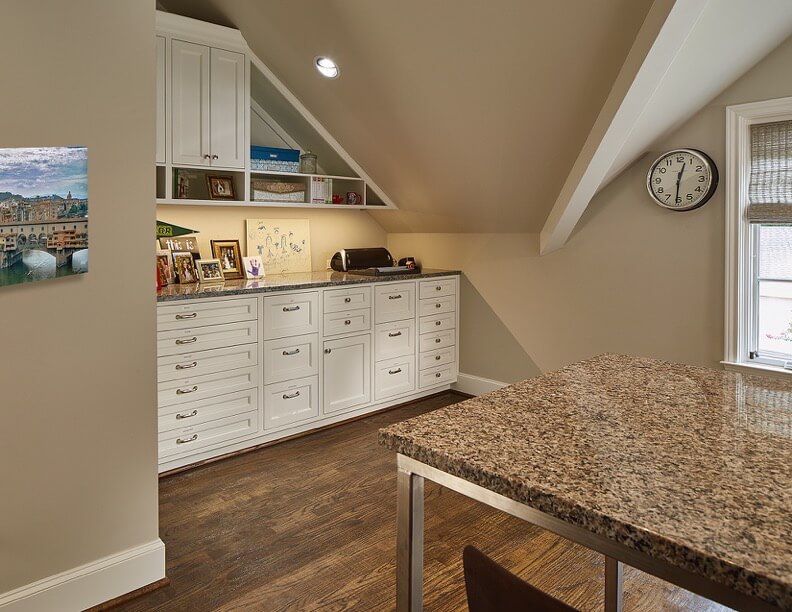 Additionally, our customer wanted to add a studio space to accommodate her thriving photography business. This was accomplished by converting a large attic space with steep pitched roof into a multi-purpose room for the family and studio with a bathroom for the photography space.