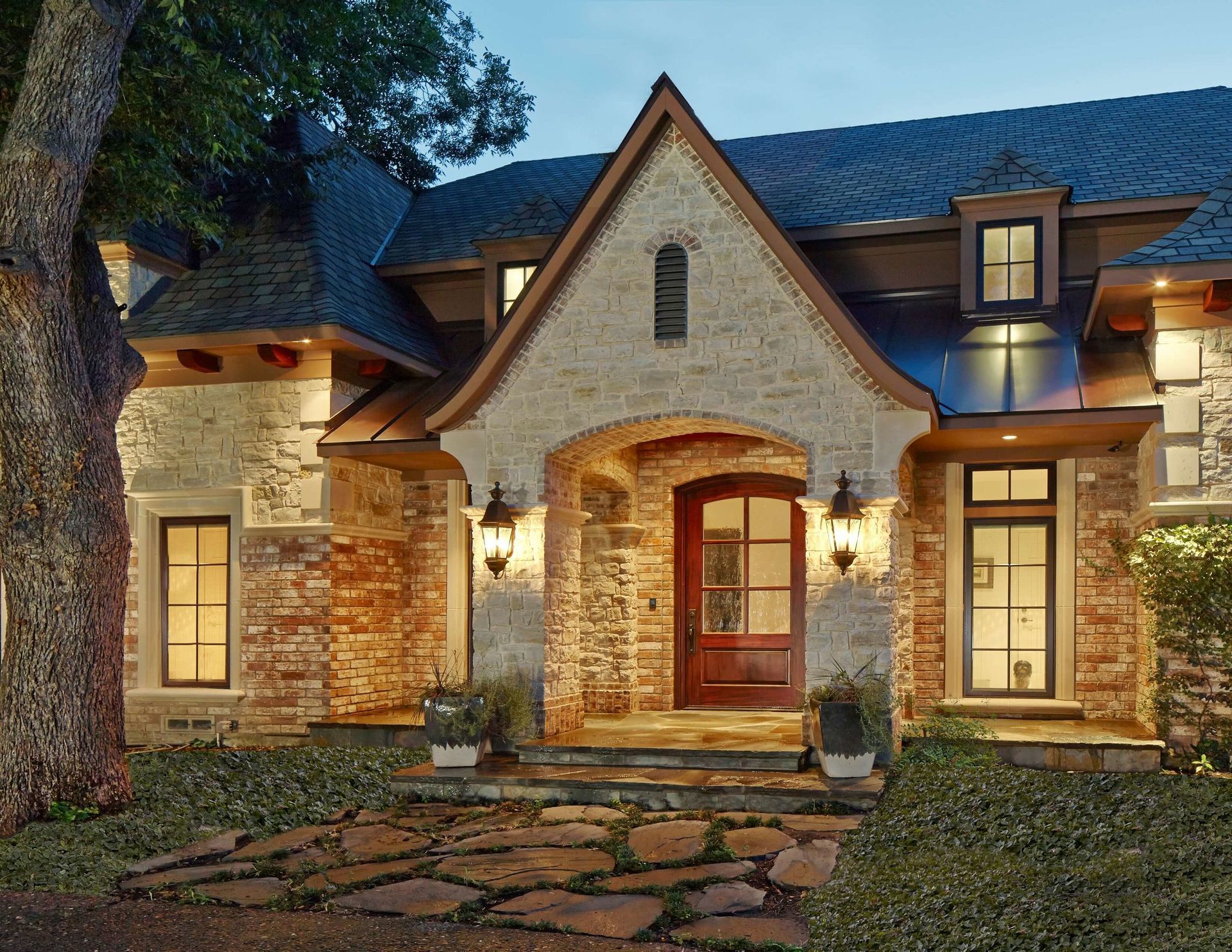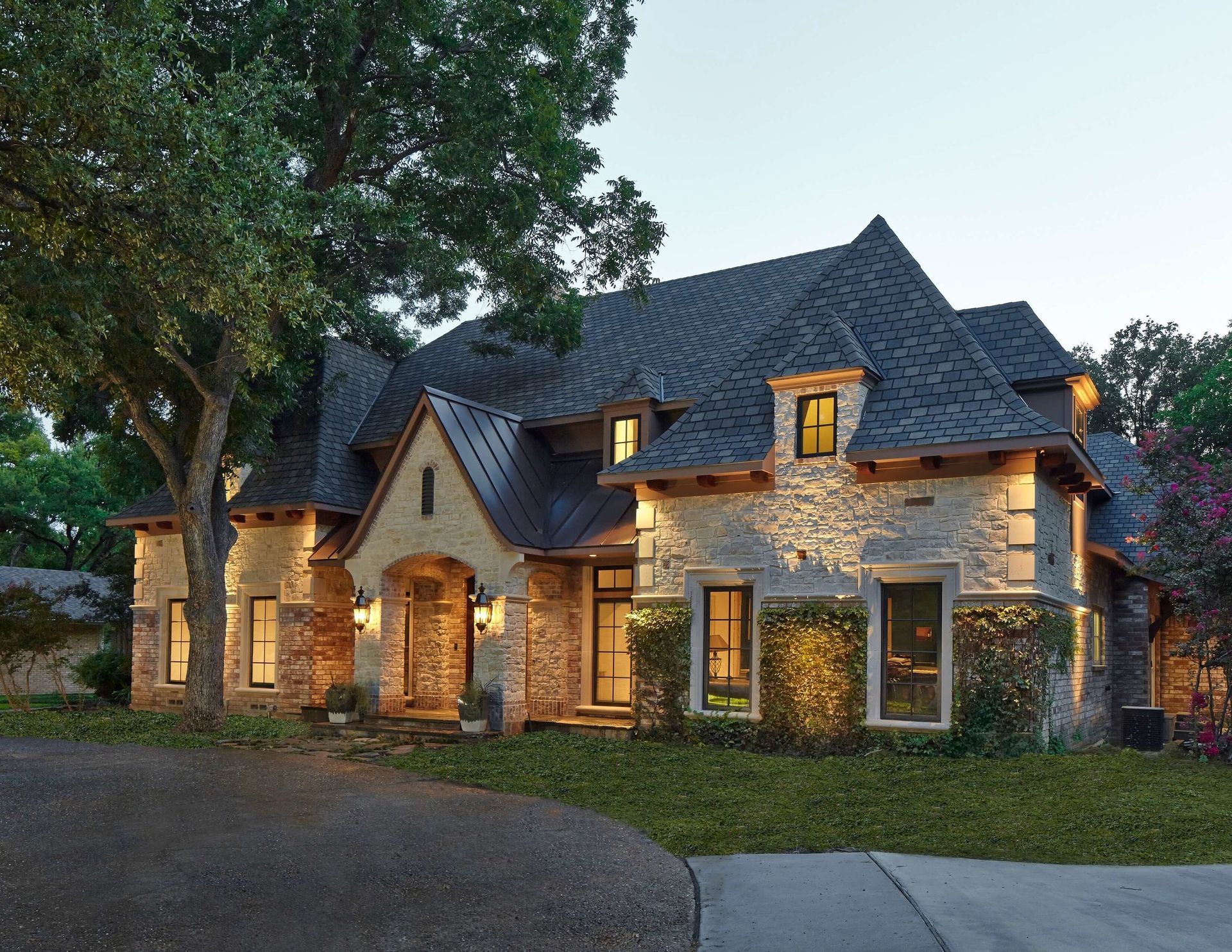 The owners of this 1972 mansard roofed home, weary of continual roof leaks and repairs, desired a façade update that would alter the flat roof design while making a bold and elegant statement. The architect chose a French Eclectic style because of its dynamic beauty befitting of the site, a pitched roof design that eliminated the flat roof and its retrofit capability allowing architectural devices to be adapted to the existing structure. The enhanced entry provides a more inviting approach while details such as the use of brick and natural stone, wood corbels and cast stone augment the continuity of the French Eclectic style befitting of this home.