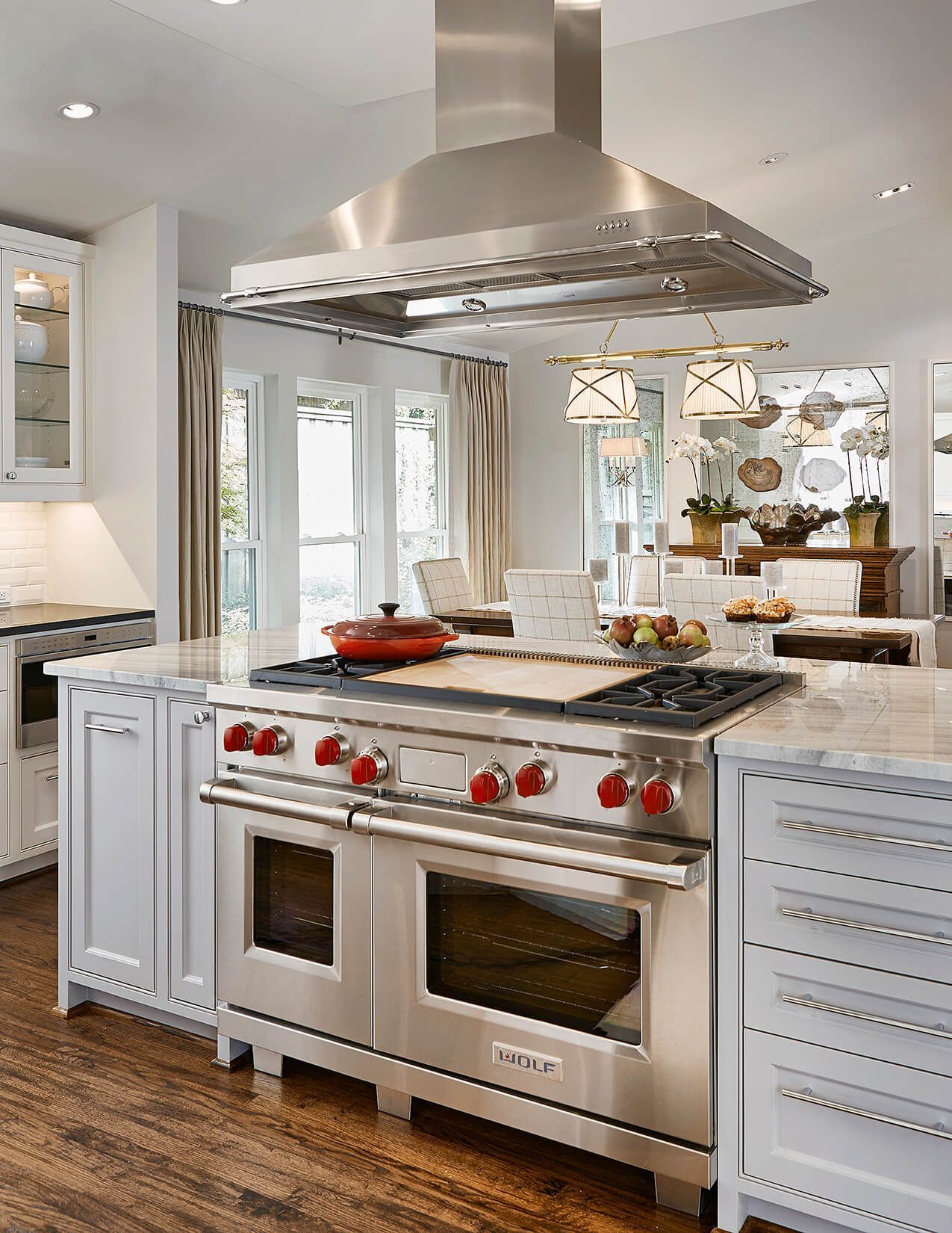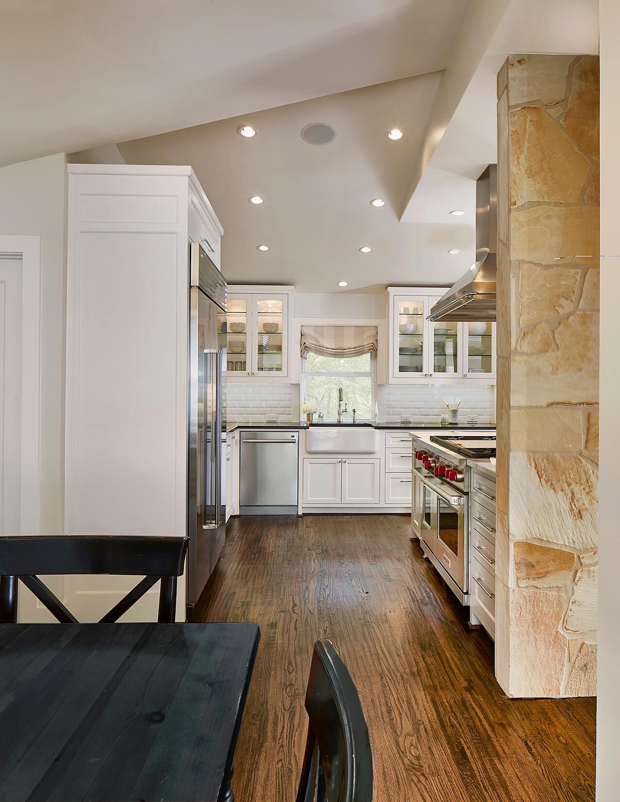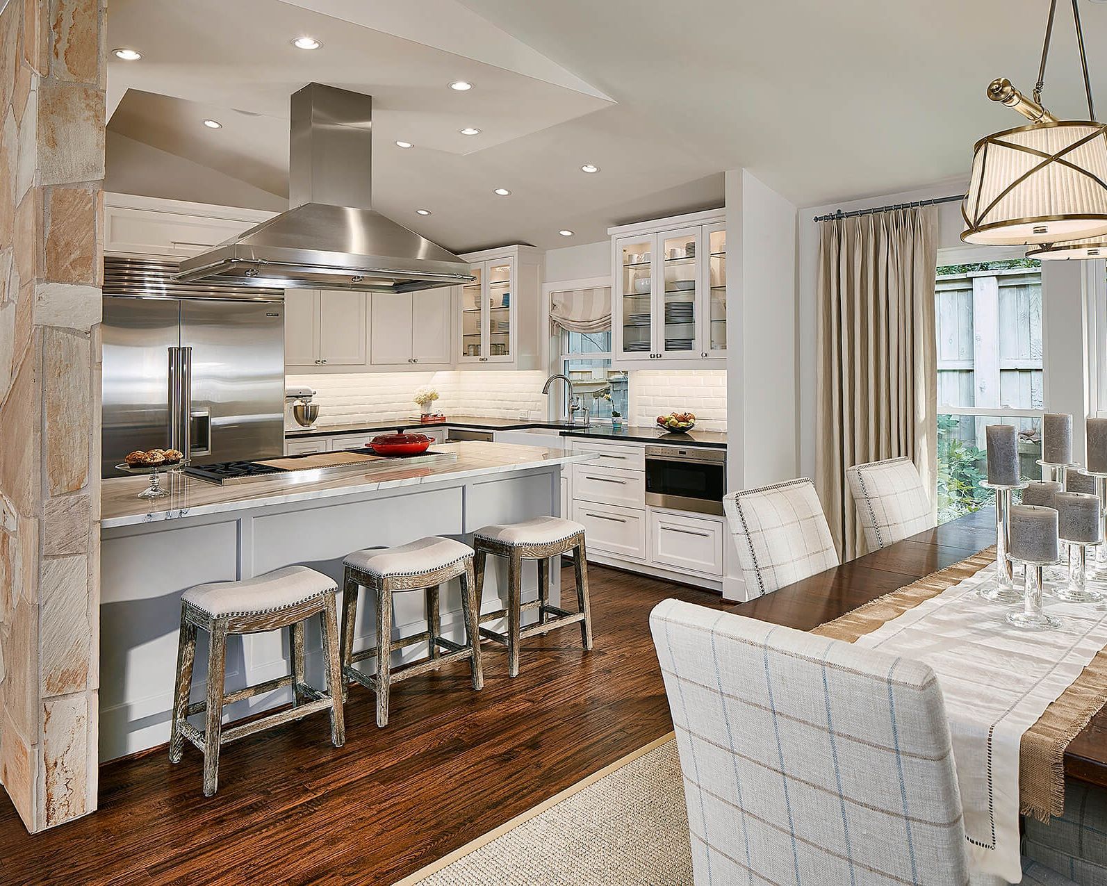 The homeowners liked the open plan and high ceilings of the living area, but felt the original 1980’s kitchen and breakfast areas with lower ceilings were outdated, isolated and closed off. Their desire was to incorporate the living, dining, kitchen & breakfast space into one cohesive design with an open flow. We solved their issues by removing walls at the kitchen and breakfast areas, sloping the ceilings of the same areas to match the existing pitch, raising the floor in the living room and installing hardwood floors throughout.