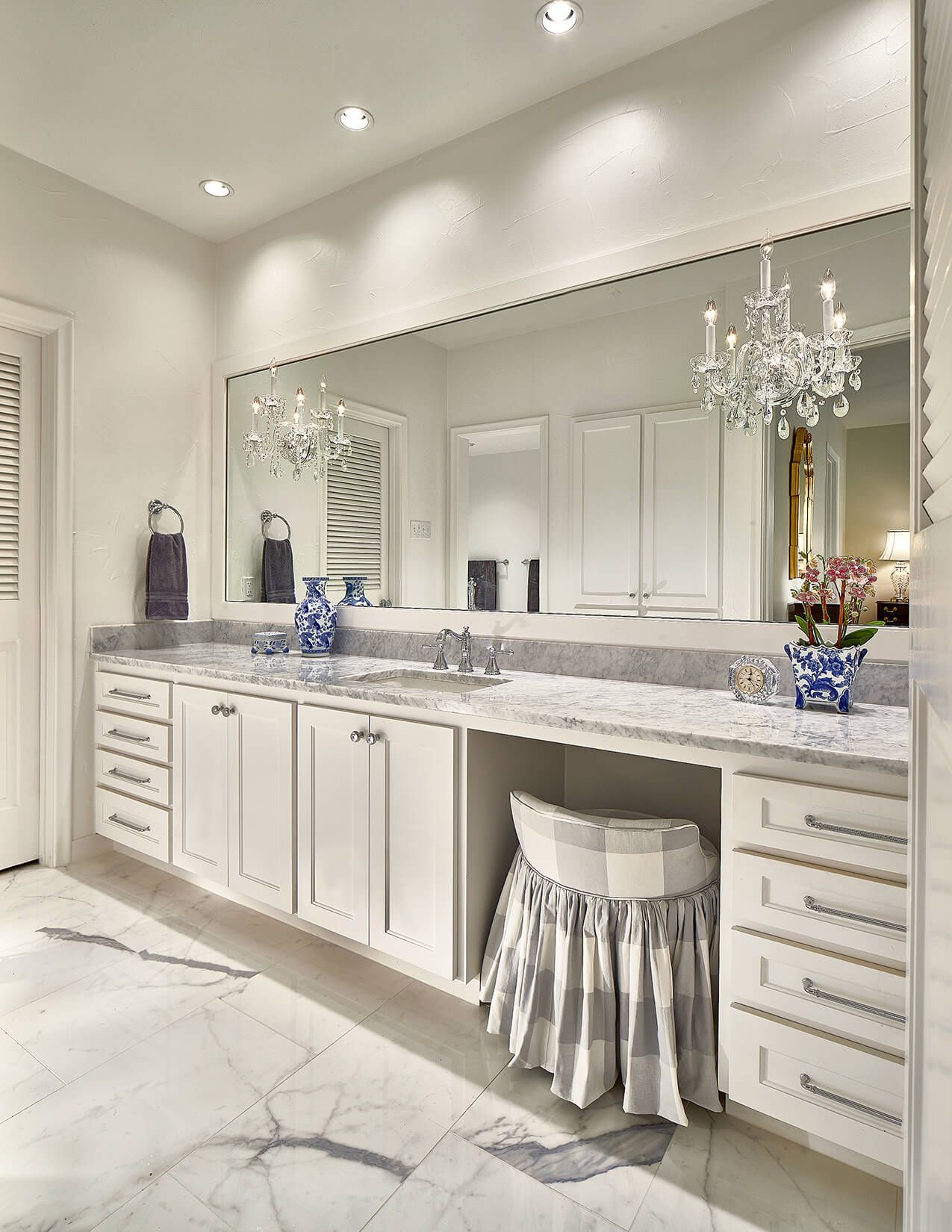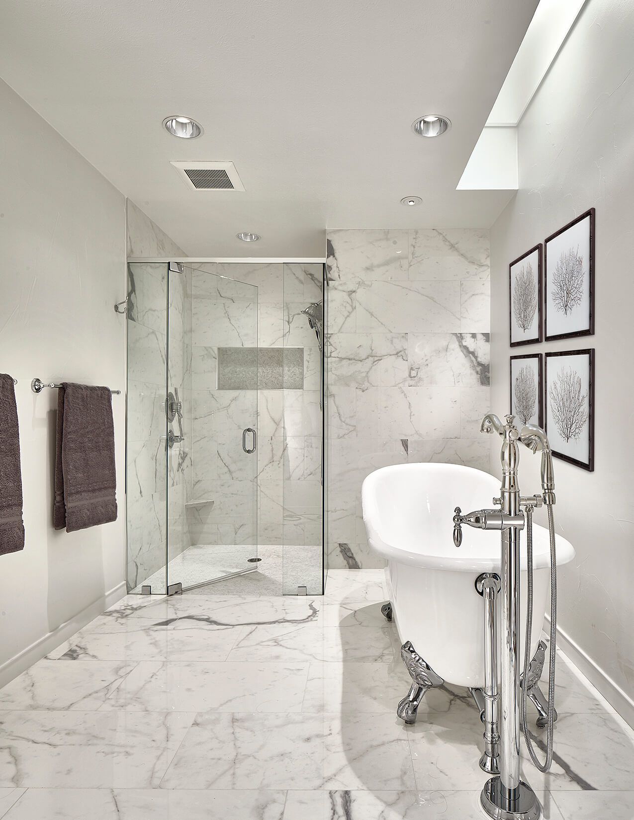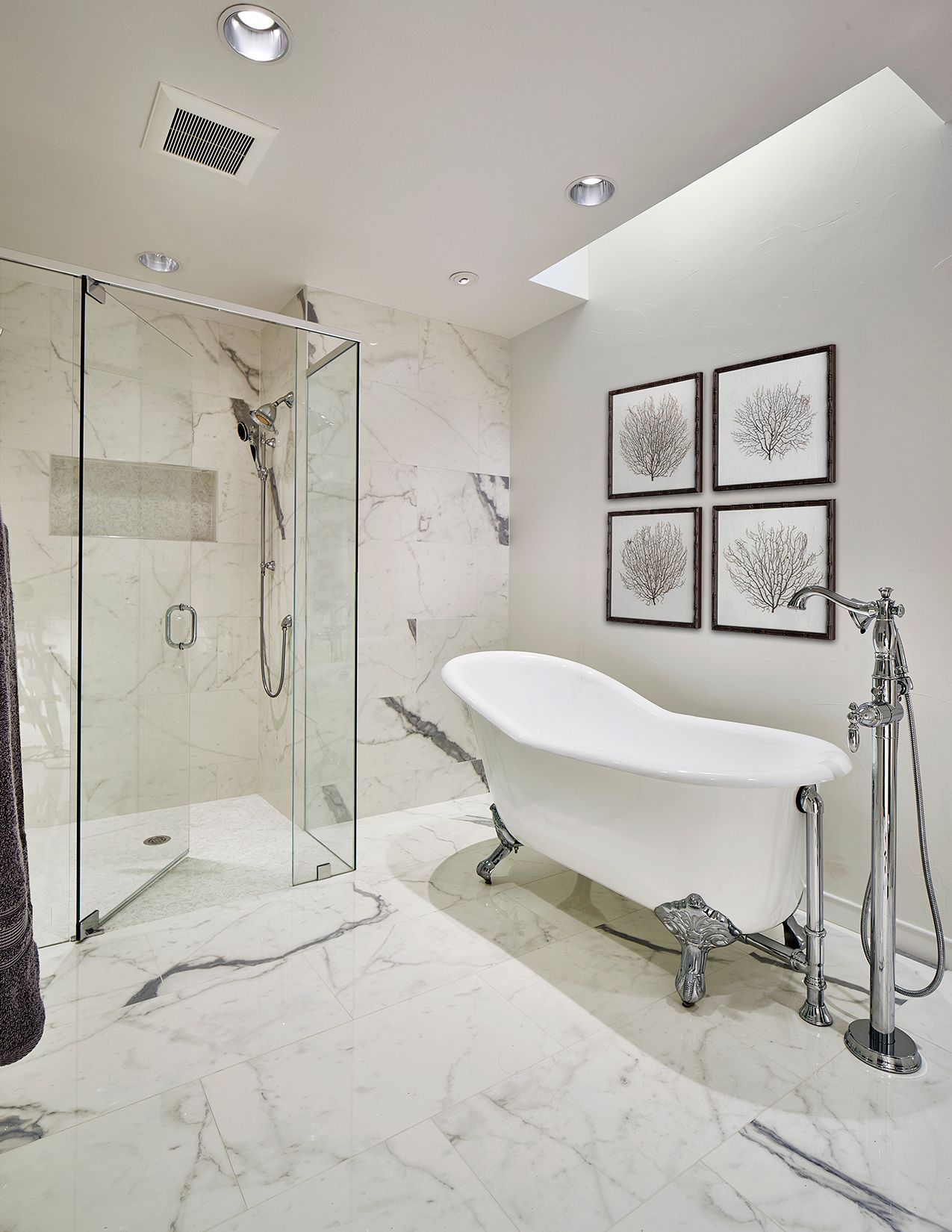 In the master bath, the existing lighting was poor and there were no windows to provide natural light. Also, there was a level change from the vanity area to the tub and shower area. Since the walls were all interior there was not an opportunity to introduce a window. So, the solution was to go up with a hybrid skylight solar tube. This was the first step in a series of upgrades including tile, plumbing fixtures, cabinets, etc. that transformed a drab space into a bright and enjoyable master bathroom.