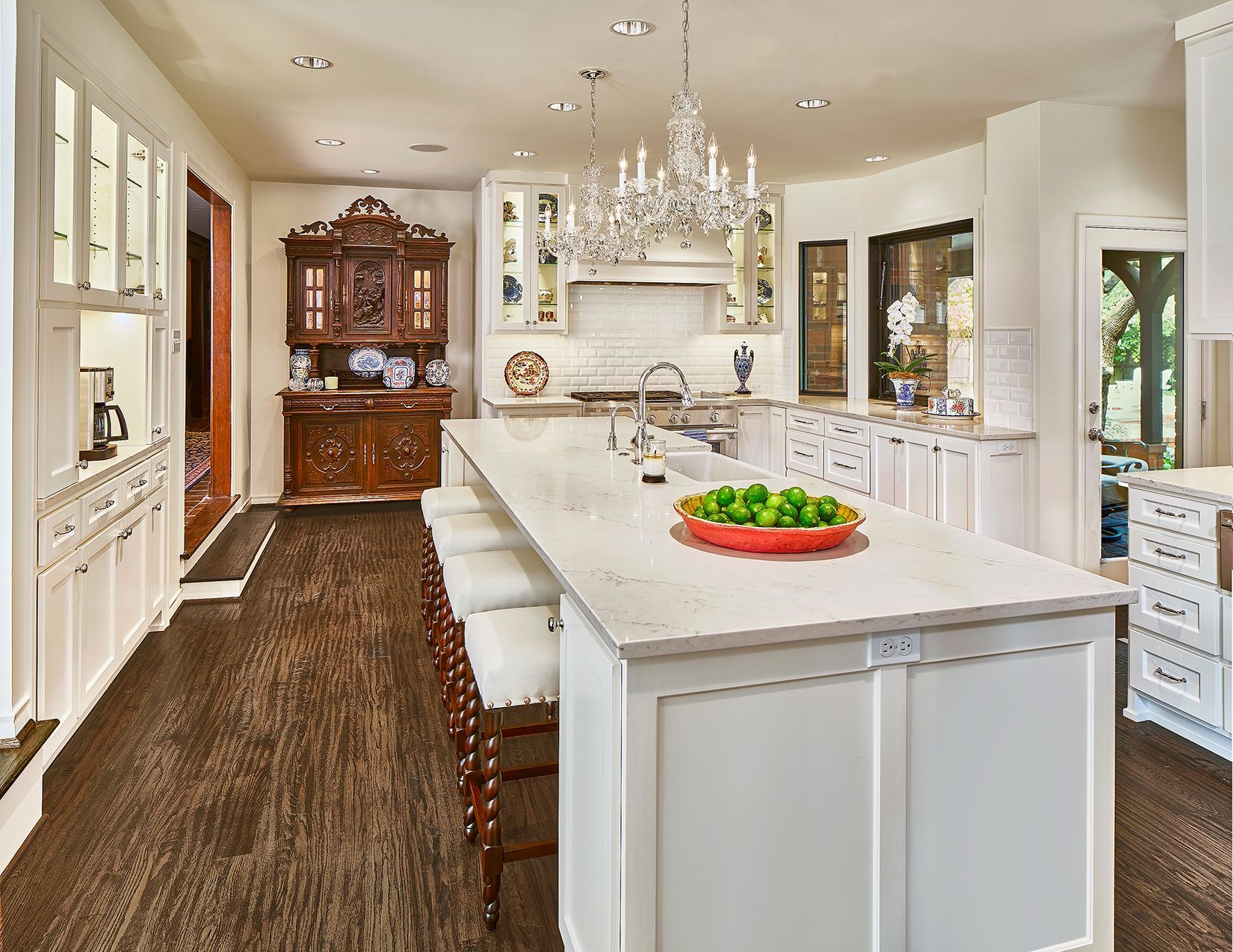 The kitchen was expanded in size to accommodate their 100 person parties, improve the floor plan, function and lighting, and update the finishes. The existing kitchen was small and tucked into a corner, two steps above an oversized and underused breakfast area. The design consensus was to swap the existing breakfast area with the existing kitchen and add additional square footage by removing a redundant half bathroom and reworking the laundry room.
